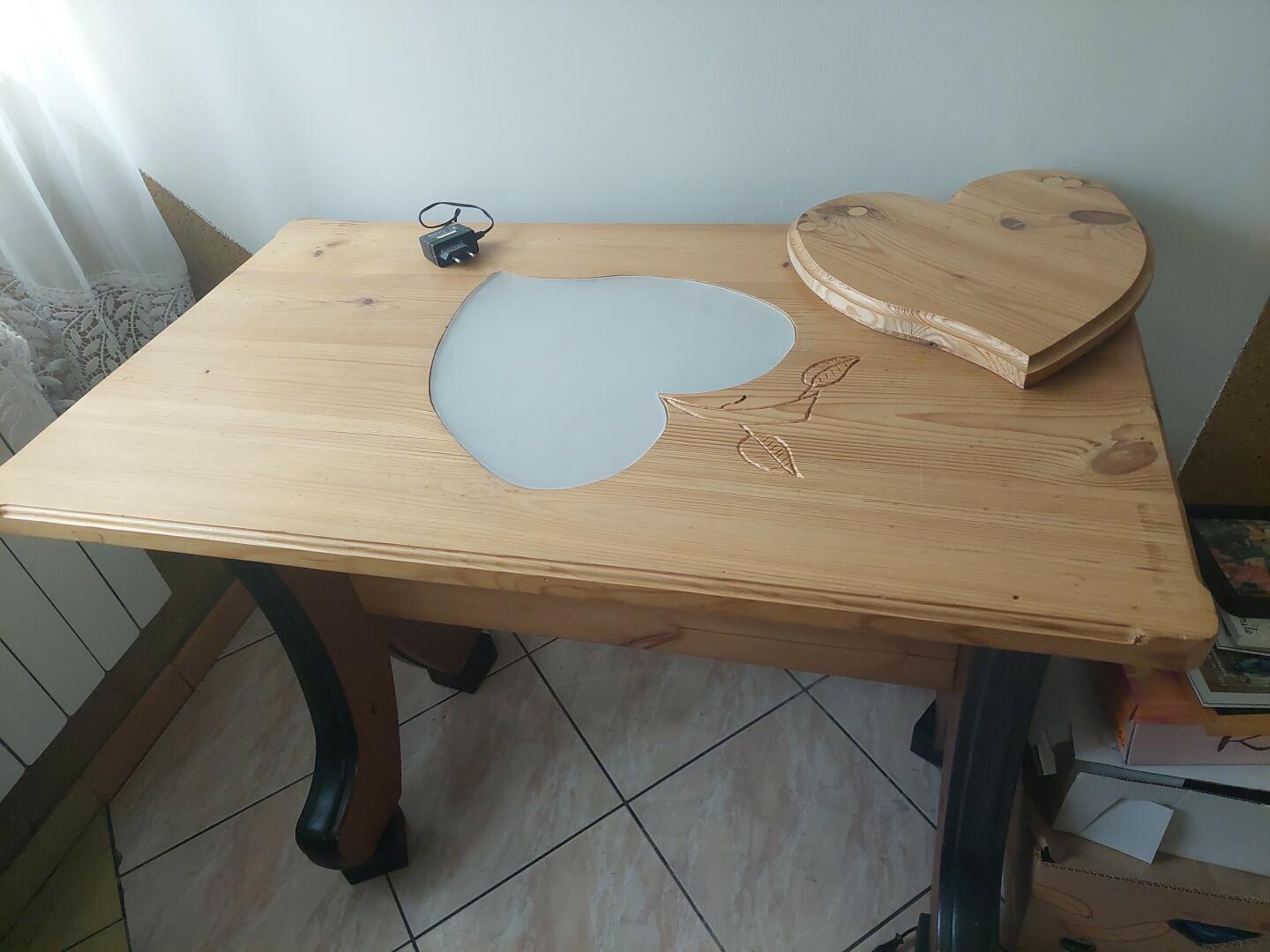 Stół posiada w blacie ozdobne ledowe podświetlenie w to miejsce można włożyć z drewna liść który może służyć jako podstawa po coś , nogi posiadają regulację poziomowania